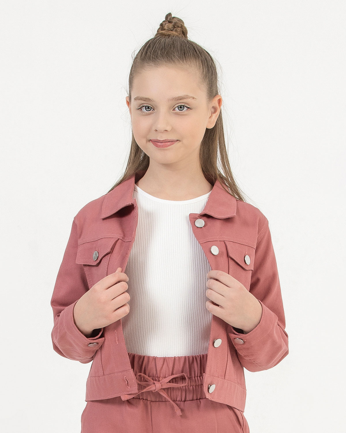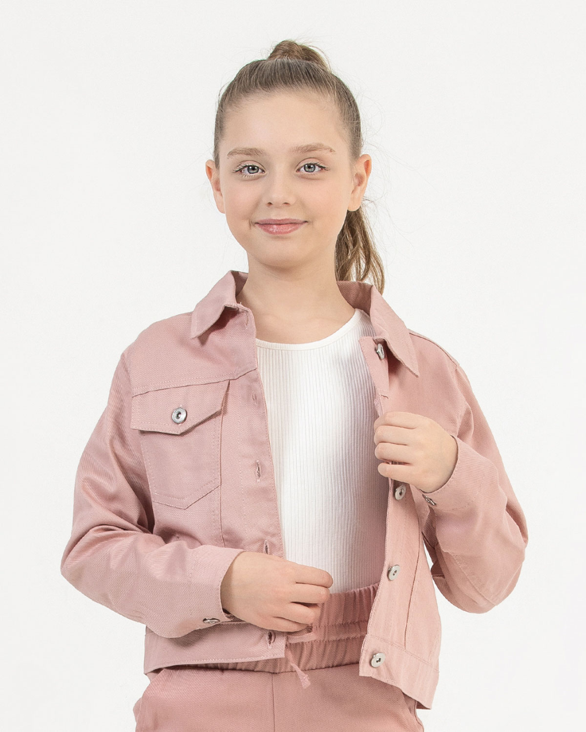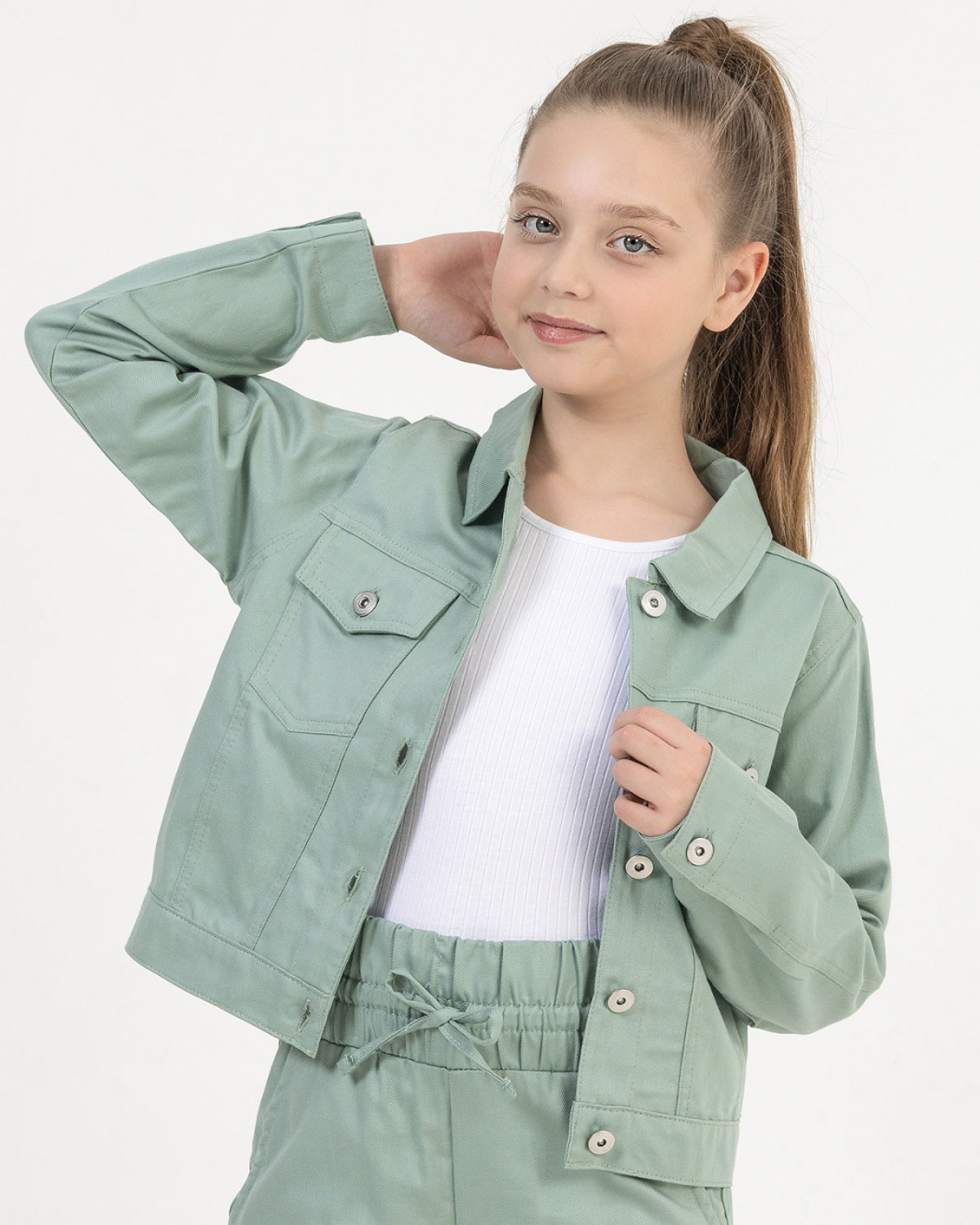 Однотонный жакет для девочки с двумя накладными карманами выполнен из хлопкового денима, застегивается на пуговицы. Смело комбинируйте такую куртку с самыми разными элементами гардероба.