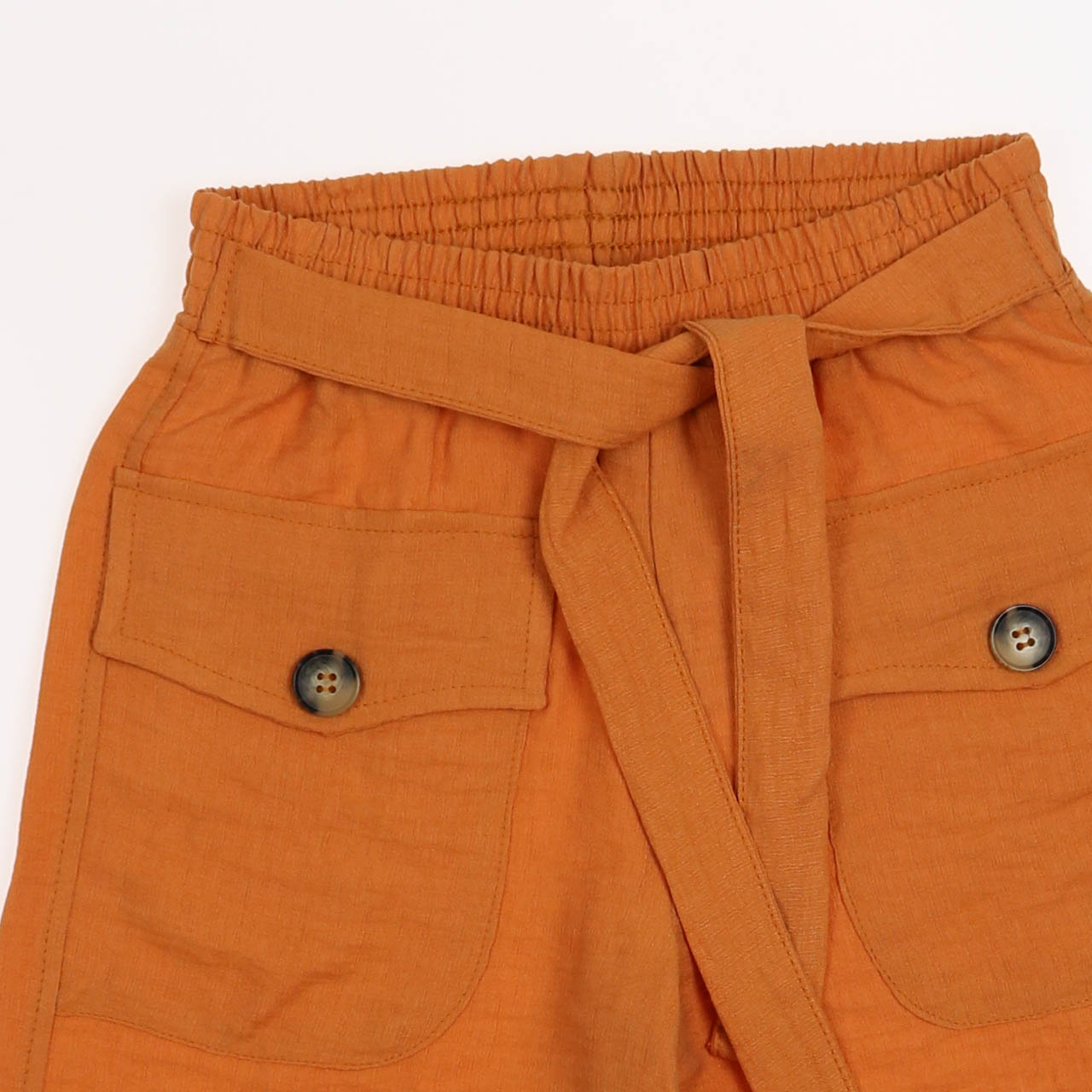 Кюлоты выполнены из тонкой вискозы на эластичном поясе, дополнены накладными карманами.