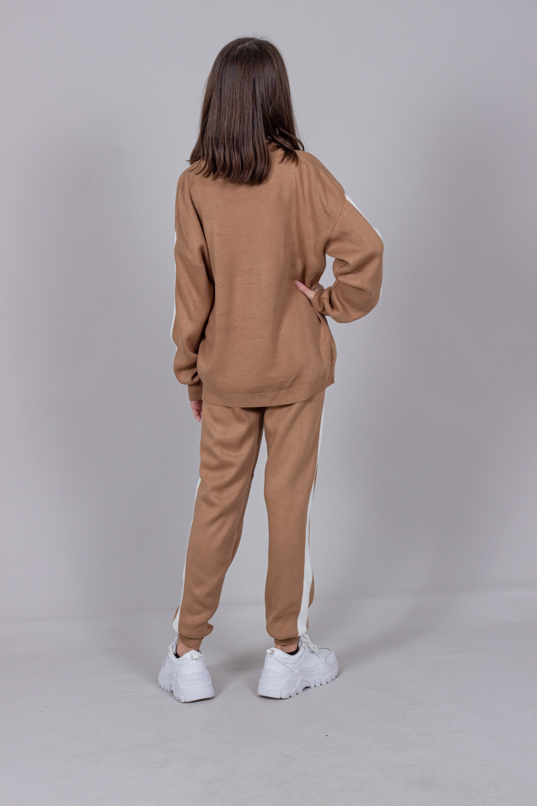 Трикотажный костюм для повседневной жизни выполнен из качественной турецкой пряжи. Костюм смотрится элегантно и стильно, отлично подходит для дома и отдыха.