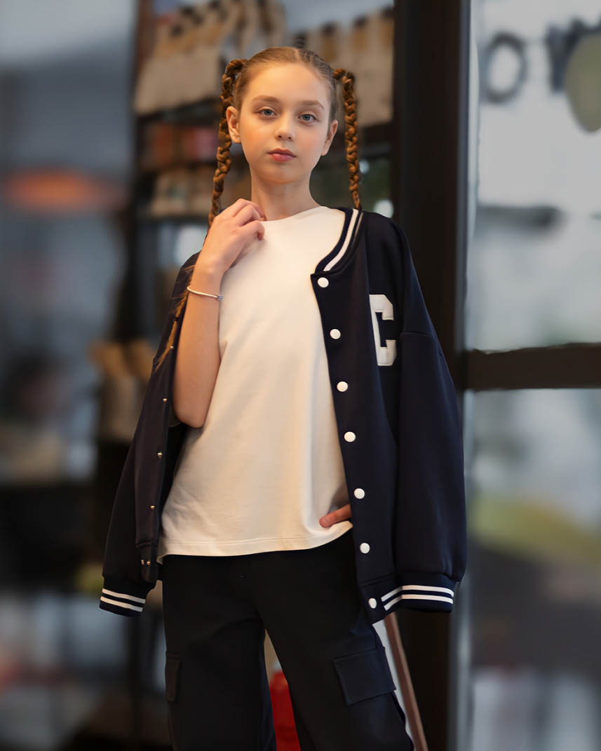 Трикотажный  бомбер dmb с начесом оптом. Бомбер школьный без лишних деталей отлично впишется в повседневный гардероб. Модель свободная, без капюшона, на манжетах.