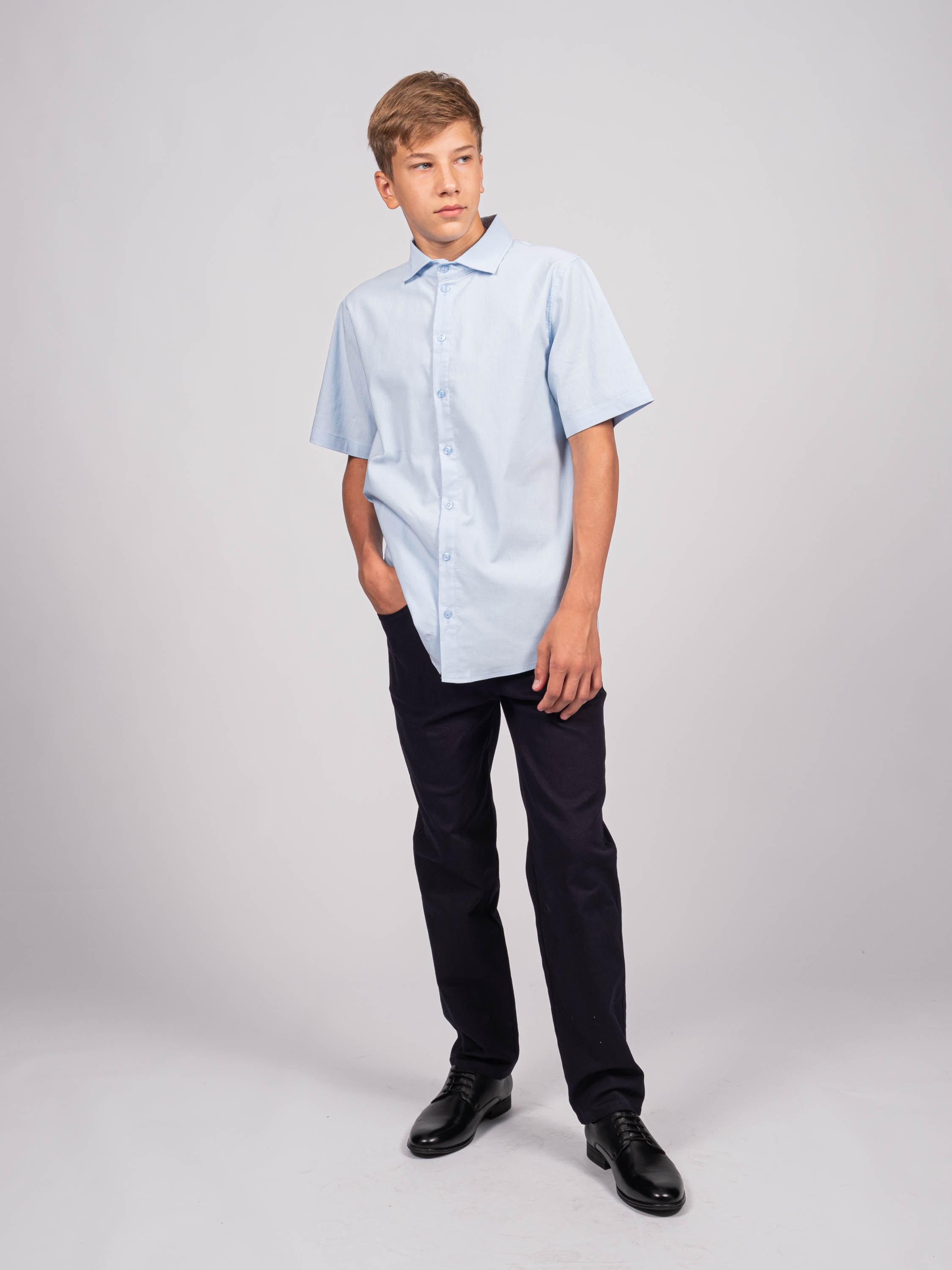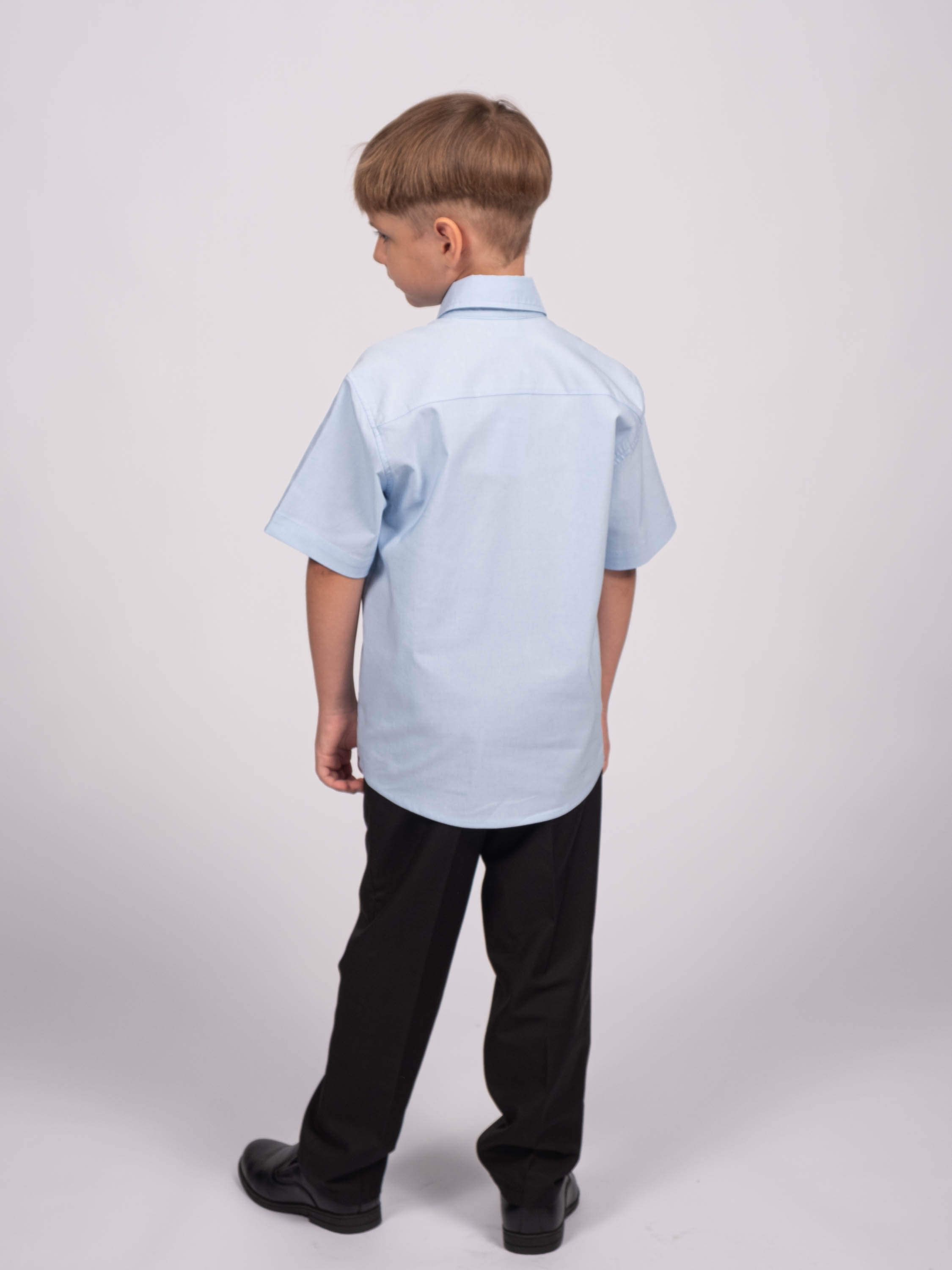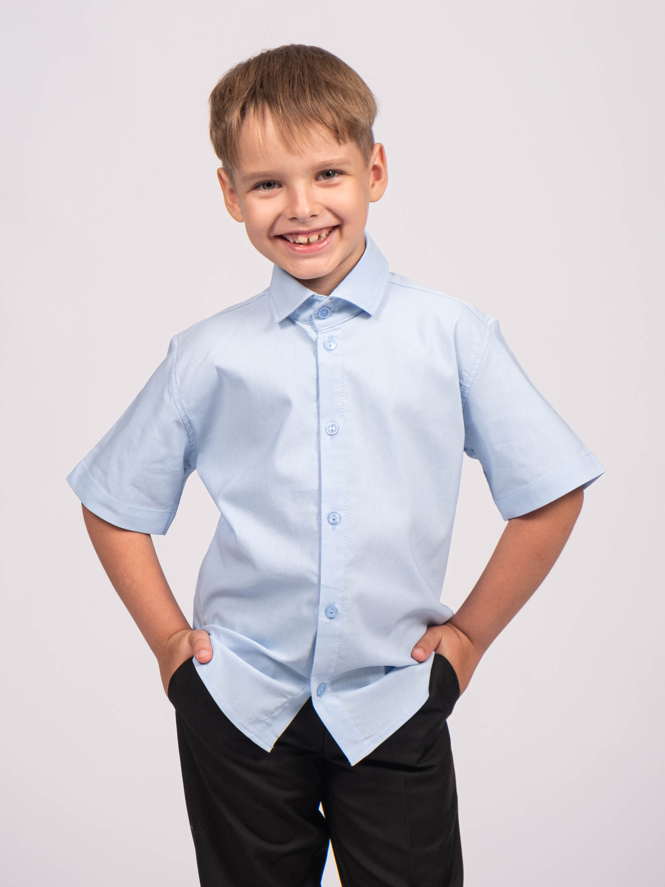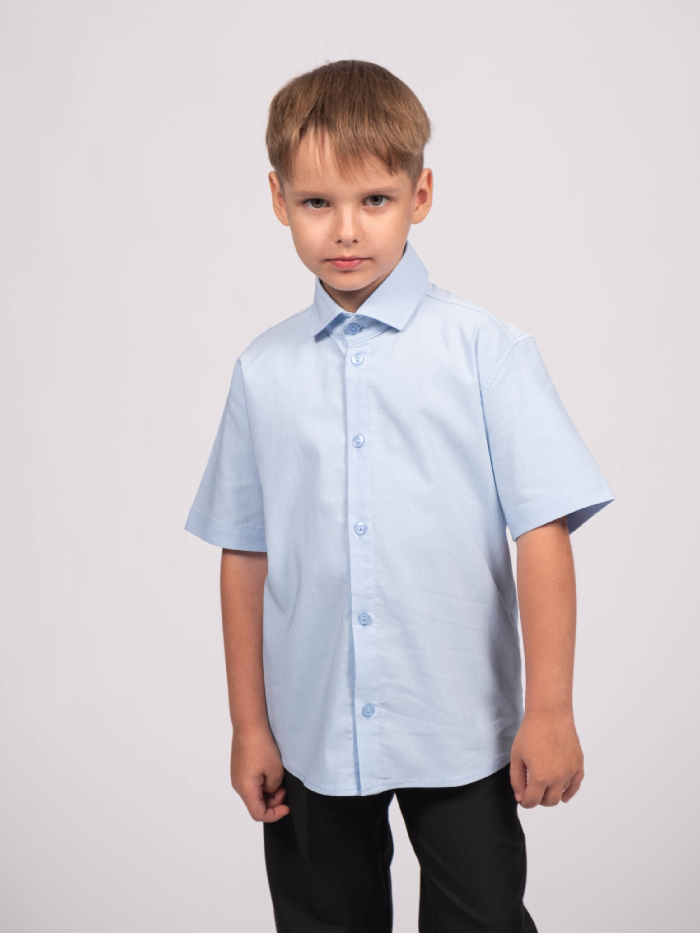 Детская однотонная рубашка для мальчиков оптом. Рубашка изготавлена  из смесового материала высокого качества. Модель застегивается на пуговицы.