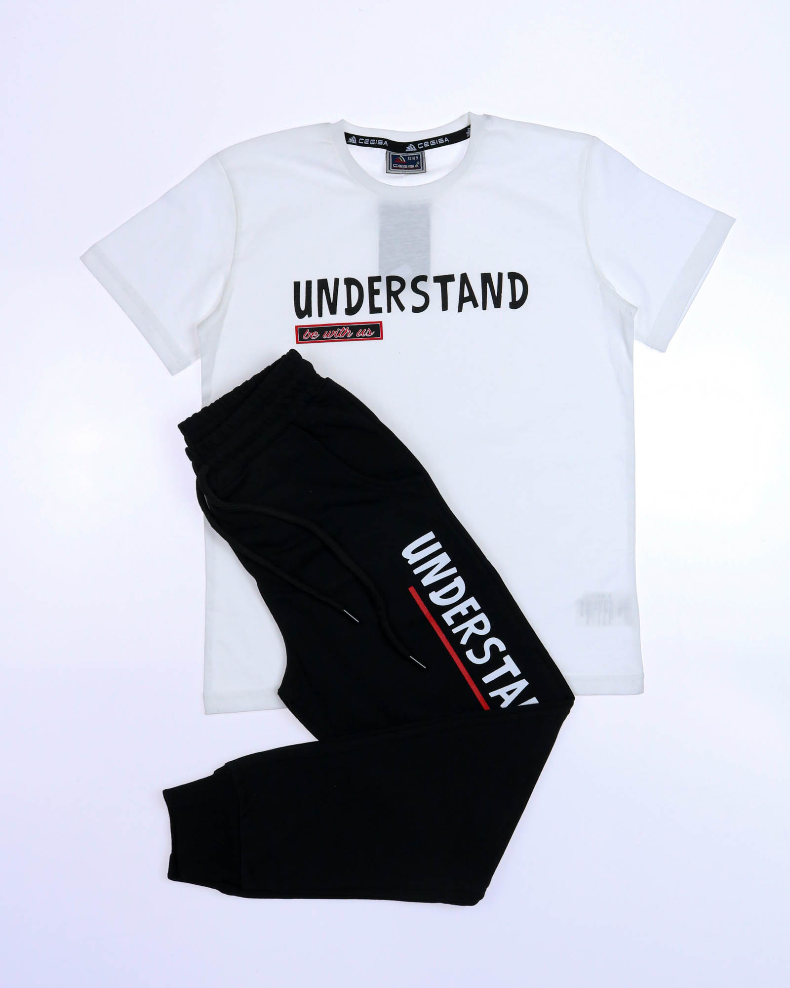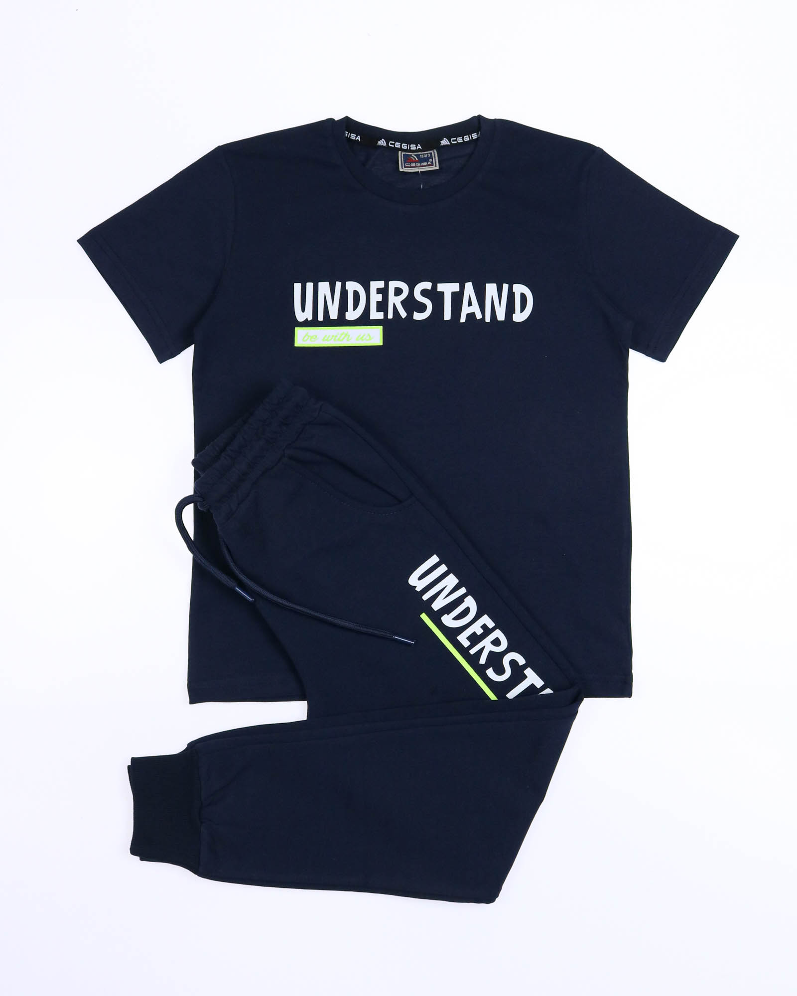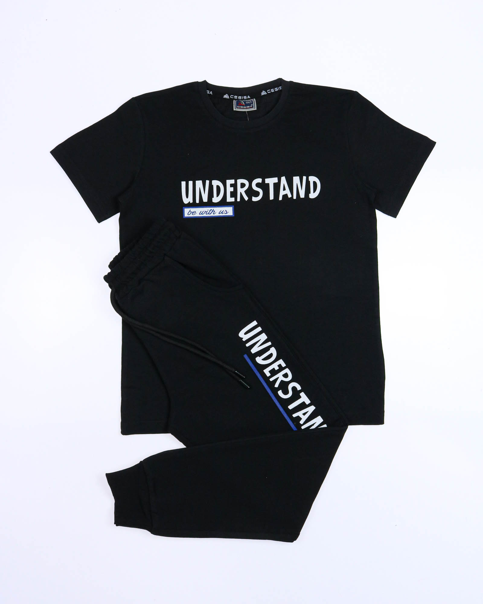 Трикотажный костюм CEGISA из хлопка оптом. Брюки выполнены из футера 2х нитки (петля) с карманами, на эластичном поясе с регулируемым шнурком и оригинальным принтом. Футболка выполнена из кулирной глади, прямого кроя с округлой горловиной.