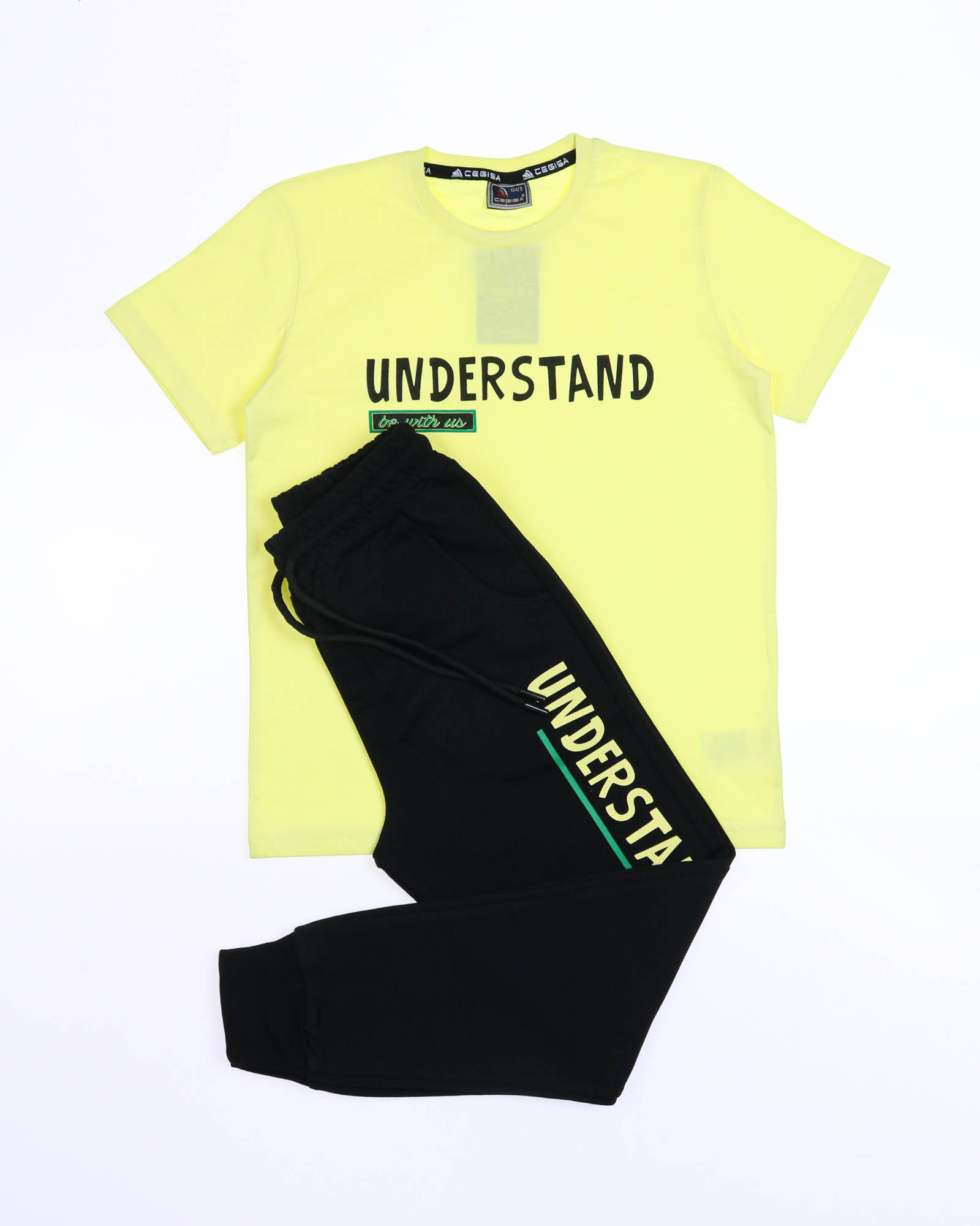 Трикотажный костюм CEGISA из хлопка оптом. Брюки выполнены  из футера 2х нитки (петля)  с карманами, на эластичном поясе с регулируемым шнурком и оригинальным принтом. Футболка выполнена из кулирной глади, прямого кроя с округлой горловиной.