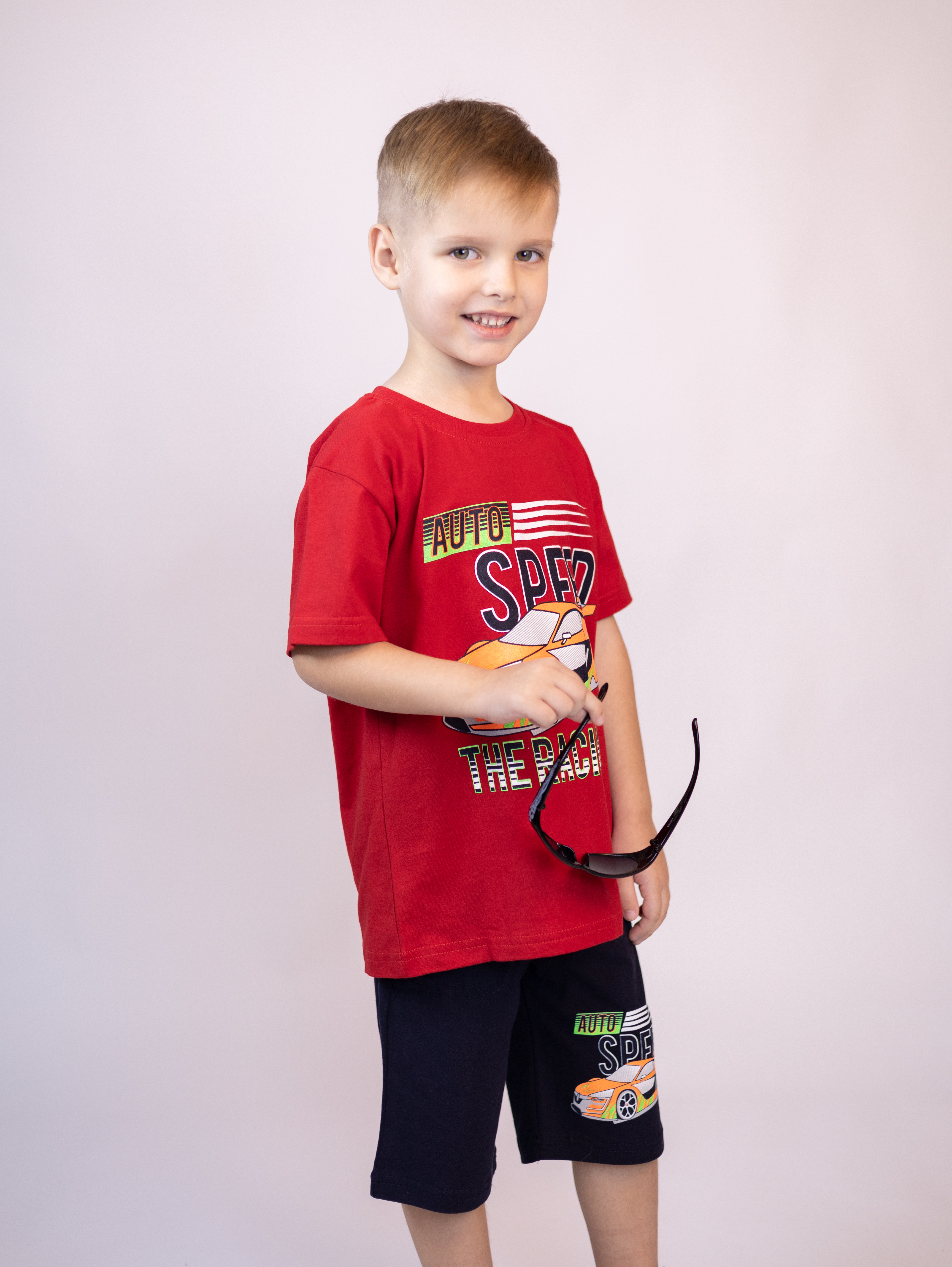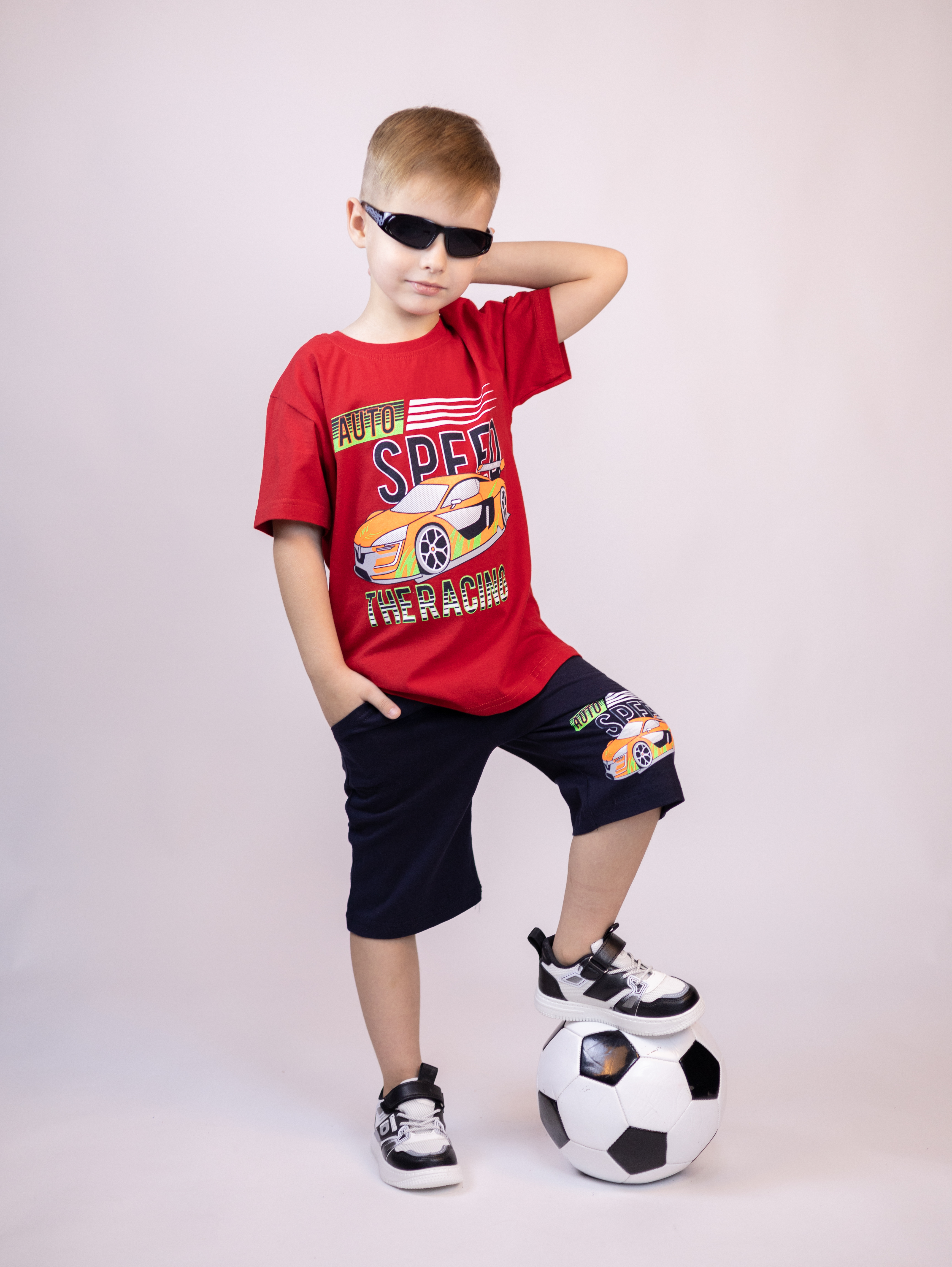 Трикожный костюм BOLD оптом из 100% хлопка с оригинальным, ярким принтом. Шорты трикотажные с карманами.