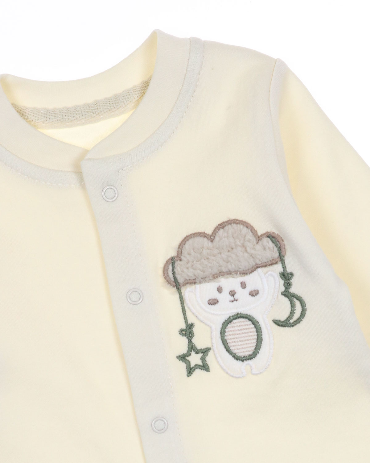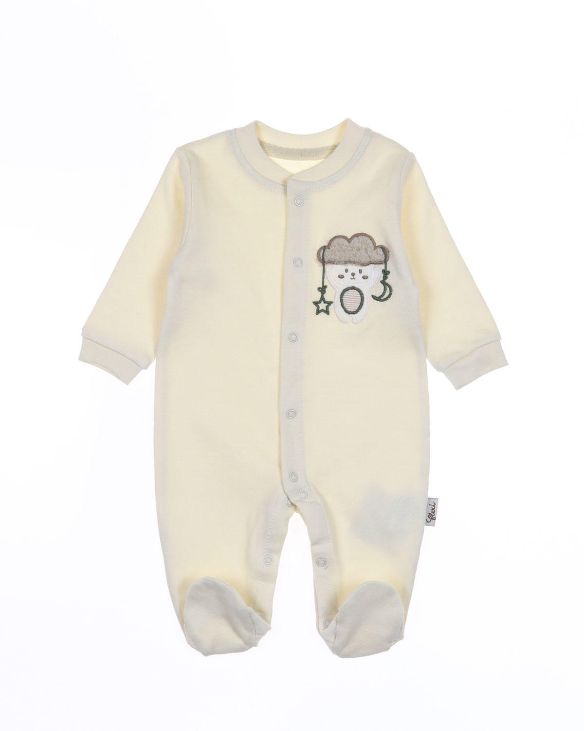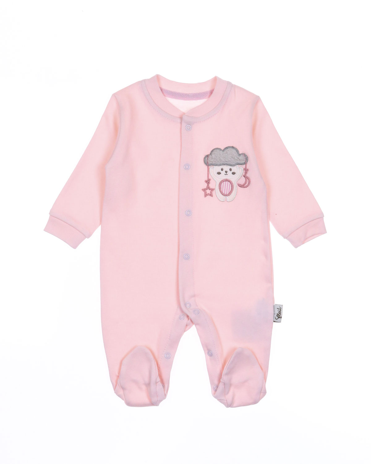 Комбинезон с закрытыми ножками не сковывает движений, имеет свободный крой и подходит для ношения подгузника. Застегивается комбинезон на кнопки.