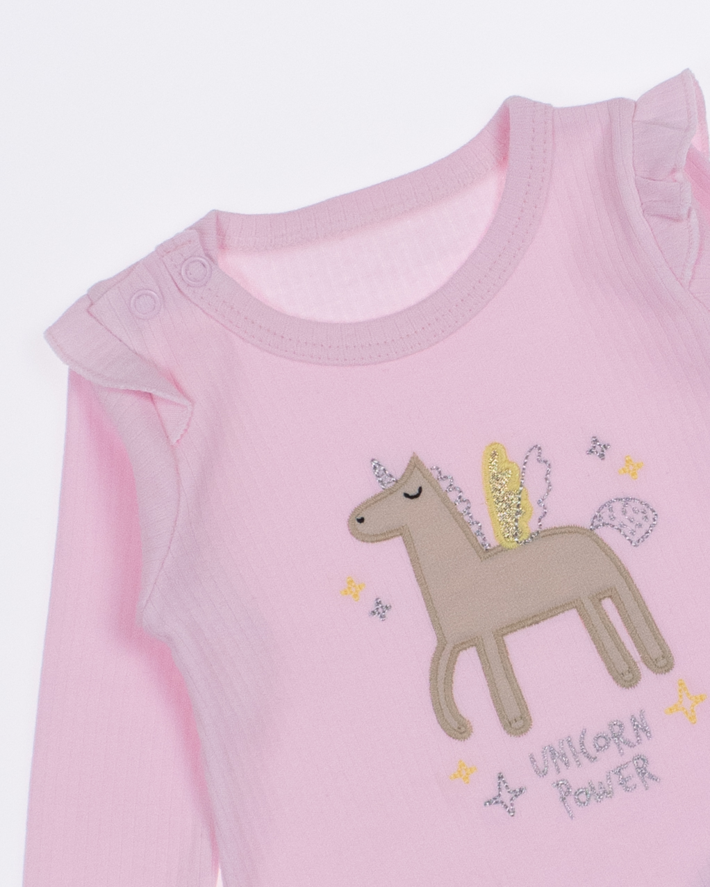 Модель имеет округлую горловину, которая обеспечивает удобство при надевании.  На груди расположен милый принт, который добавляет наряду игривости и ярких красок, подчеркивая индивидуальность маленькой принцессы. Еще одной удобной особенностью является застежка-кнопки на плече, которая позволяет легко и быстро одевать и раздевать малыша, избегая лишних усилий и дискомфорта. Этот лонгслив – отличное решение для повседневной одежды, идеальный как для прогулок на свежем воздухе, так и для домашних игр.