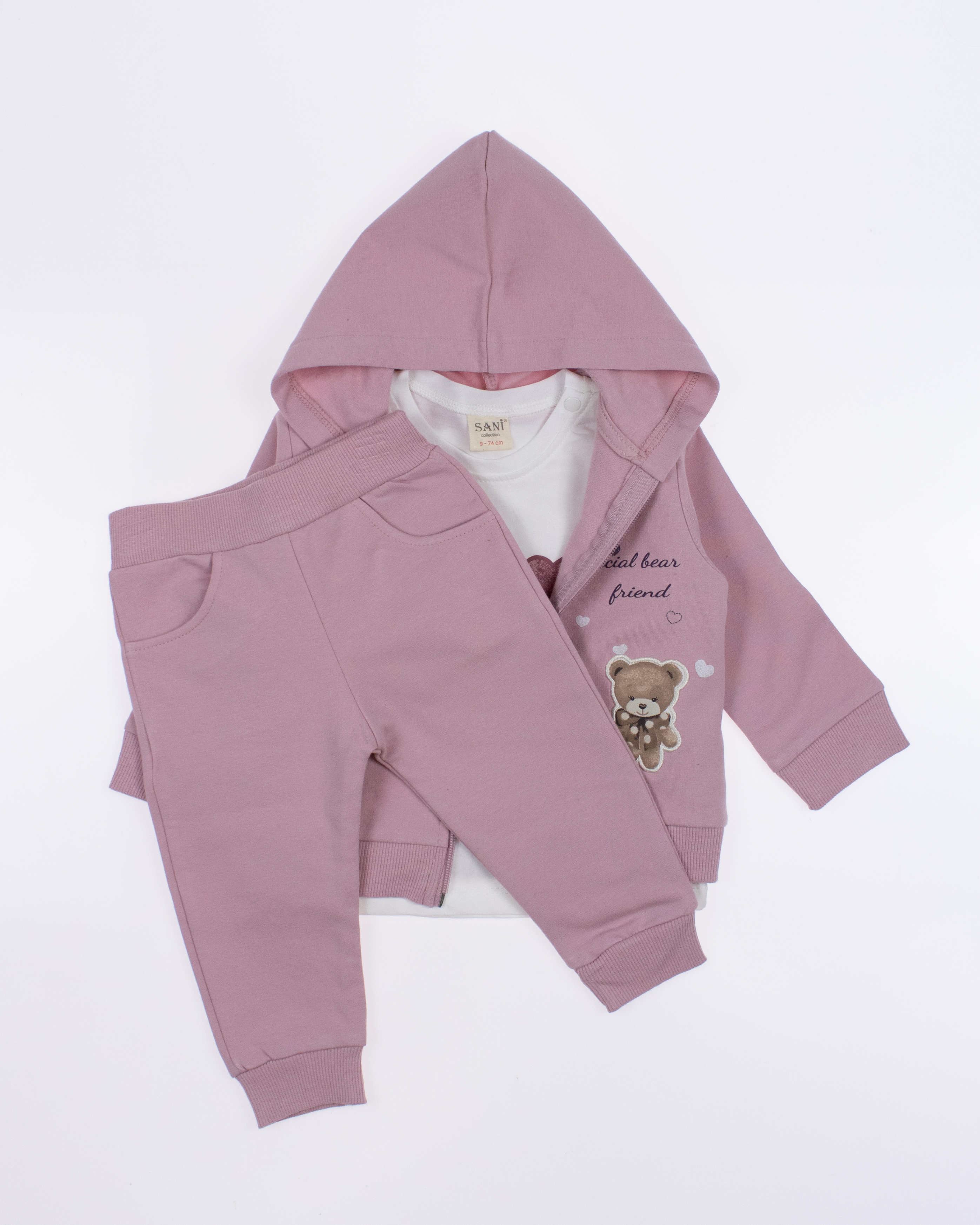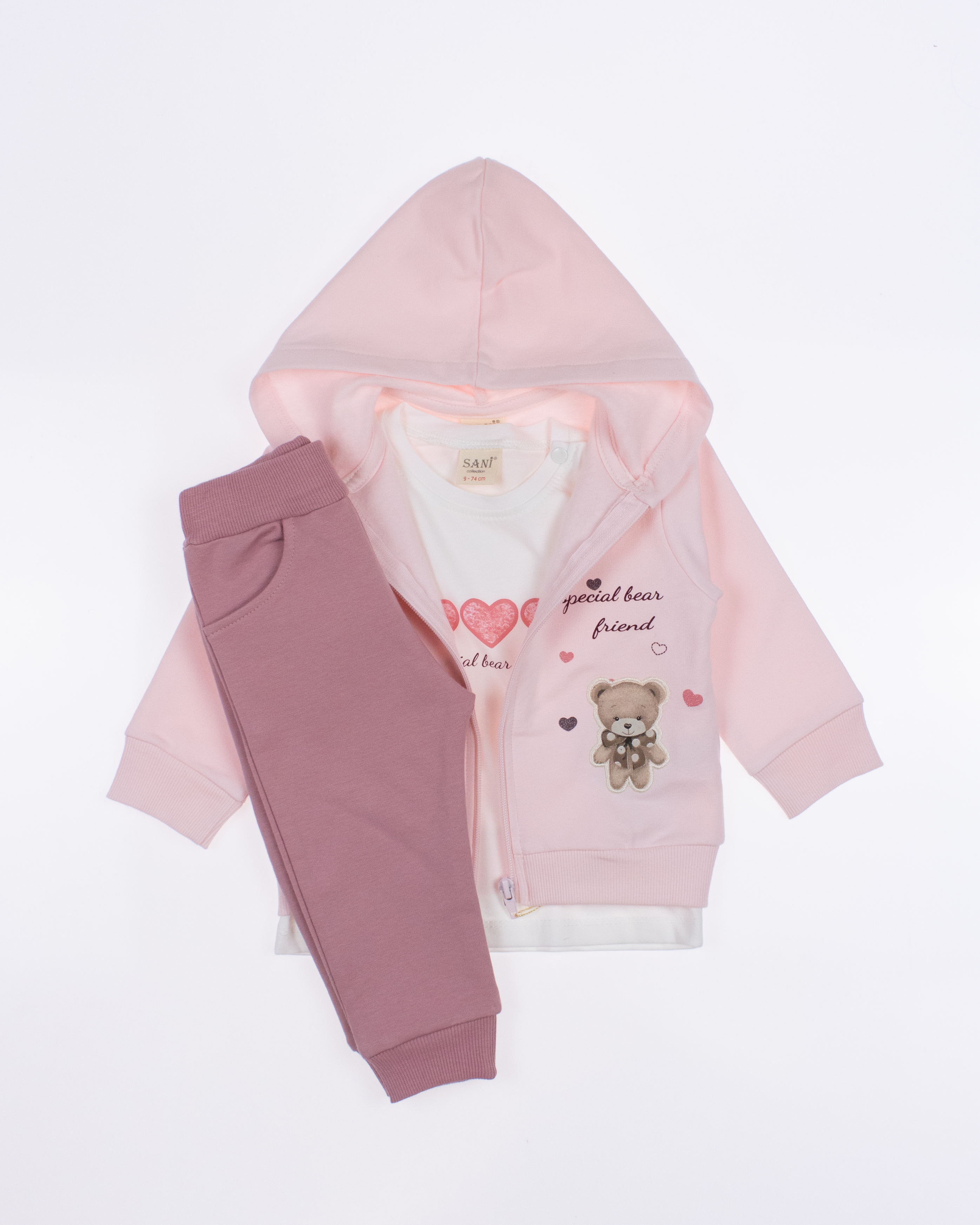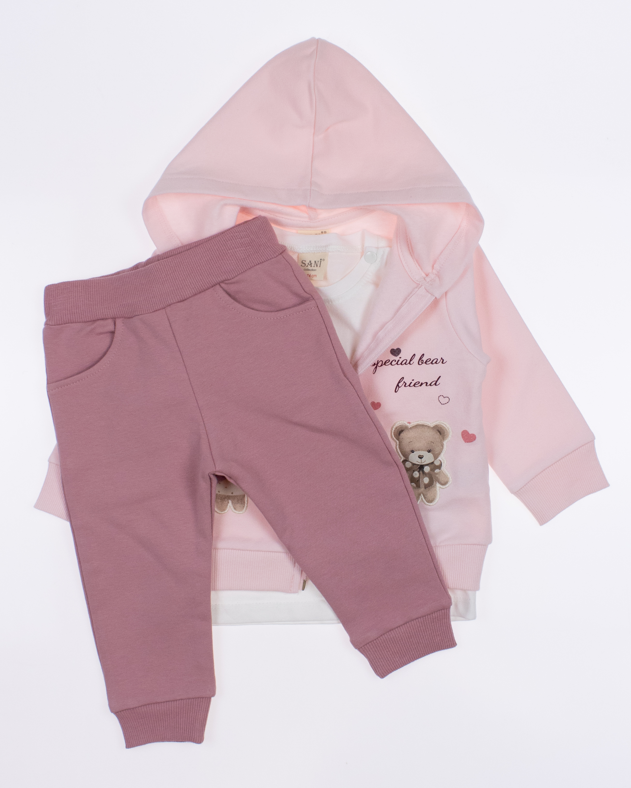 Теплый спортивный ясельный костюм оптом— это идеальный выбор для  маленькой модницы. Он состоит из трех стильных предметов, которые обеспечивают как комфорт, так и опрятный внешний вид. Костюм выполнен из качественного трикотажа  с начесом.