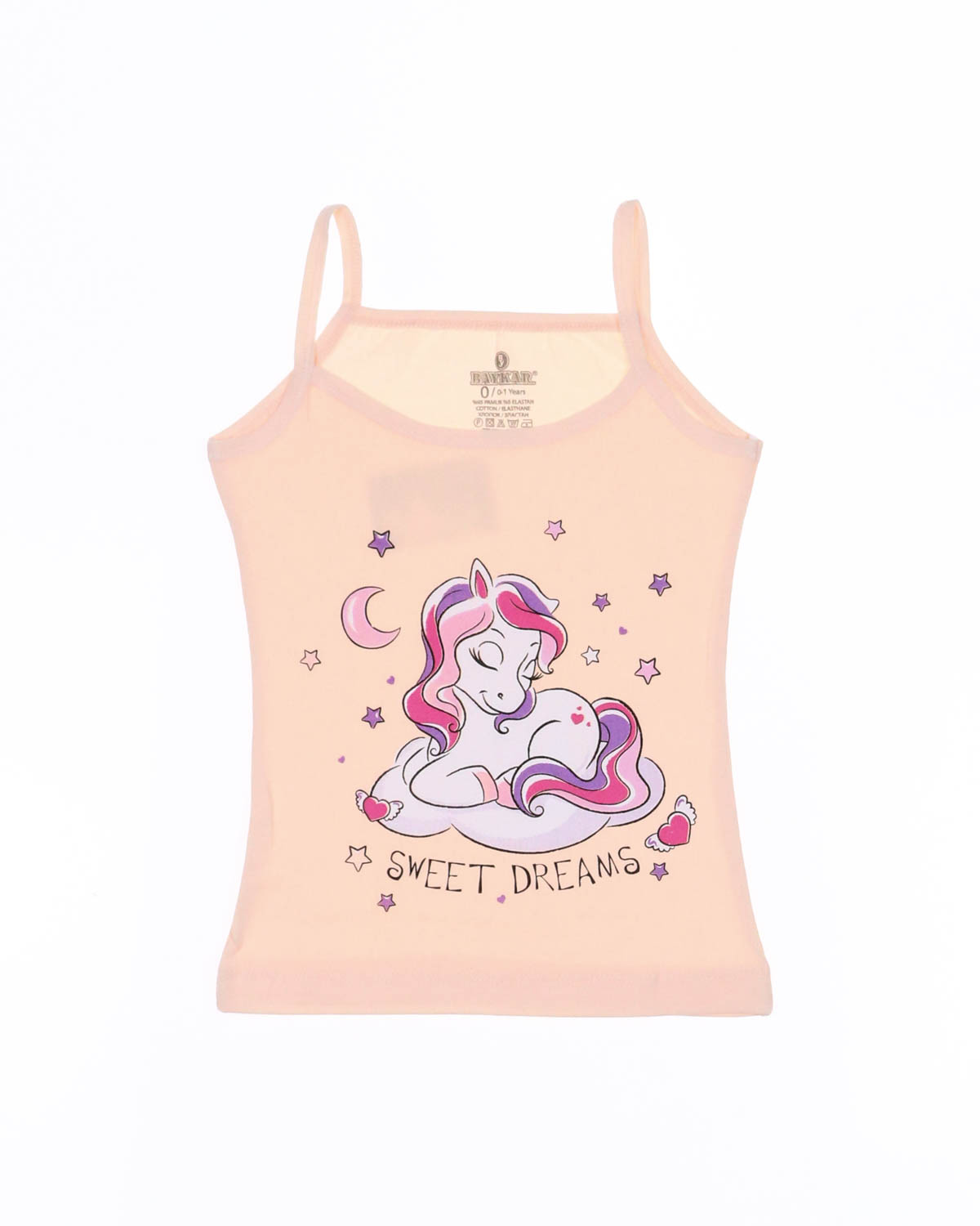 Лямочки мягко облегают плечи, фиксируют изделие в едином положении на протяжении дня, из-за чего одежда не задирается, не сползает, не перекручивается. Силуэт слегка прилегает к телу, из-за чего белье носится и полными, и худенькими девочками.. Постельный цвет маечки приятно смотрится, а принт на переднем полотне добавляет образу свежести, аккуратности и нежности. Детская одежда носится как ночнушка, нижнее белье или как белье для повседневной носки дома, в школу.